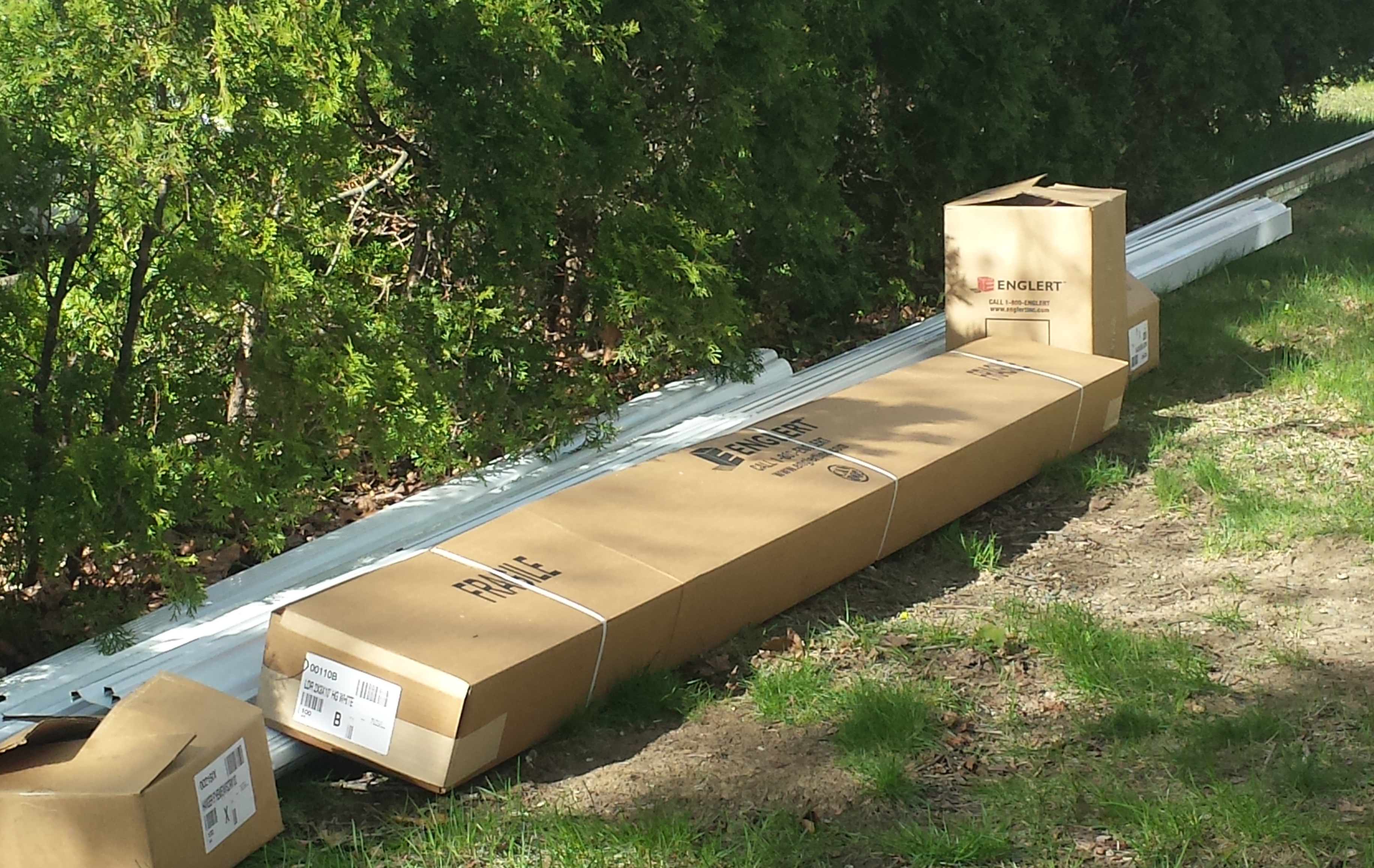 Gutter boxes laying across the side yard and waiting for installation. Get use to seeing this and more if you’re doing construction.