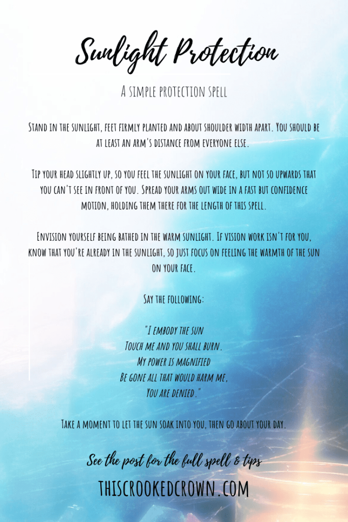 This spell isn’t intended for lengthy protection. It’s powerful, but it’s mostly geared towards needing that extra bit of protection on the go. So if you’re about to head into a job interview or on a date, this is a great spell to choose. It usually lasts as long as the sunlight does (although, there is some lingering protection affect that go one for something like 12-20 hours after the spell’s cast).