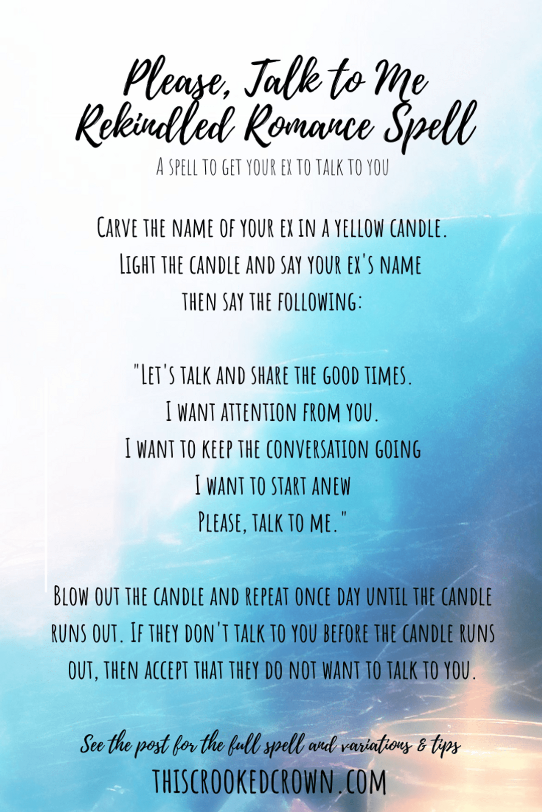 This spell is to increase communication between former lovers. This spell isn’t intended to bring your ex back, but it’s intended to open the lines of communication to see if reuniting is even possible.