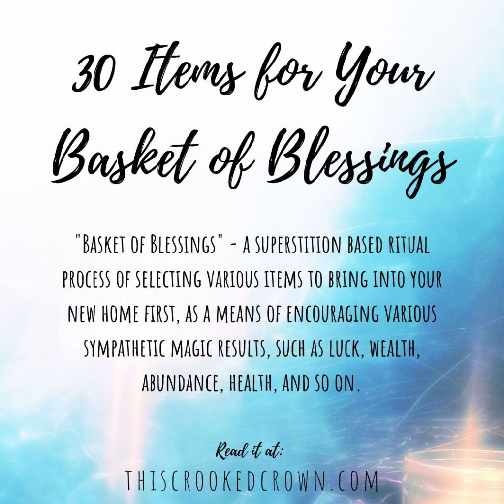 “Basket of Blessings” – a superstition based ritual process of selecting various items to bring into your new home first, as a means of encouraging various sympathetic magic results, such as luck, wealth, abundance, health, and so on.