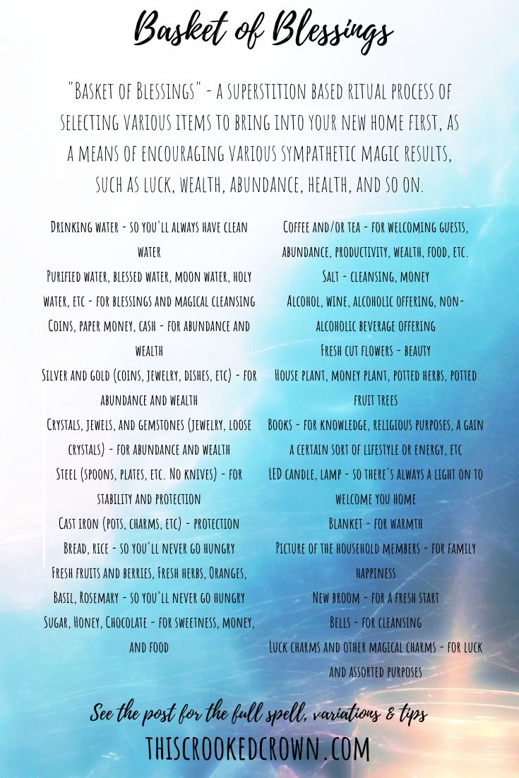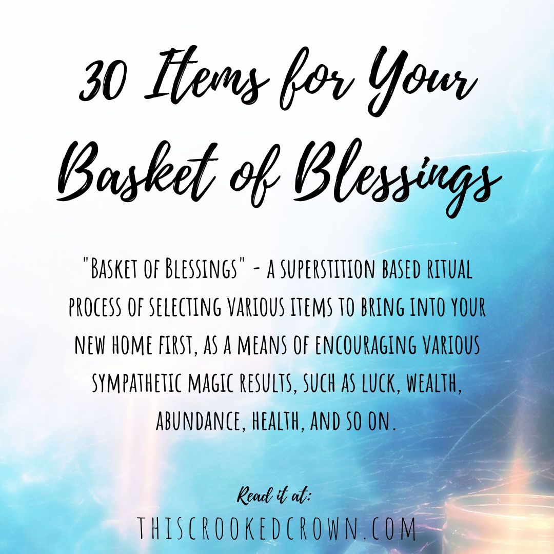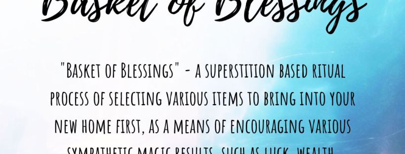 “Basket of Blessings” – a superstition based ritual process of selecting various items to bring into your new home first, as a means of encouraging various sympathetic magic results, such as luck, wealth, abundance, health, and so on.