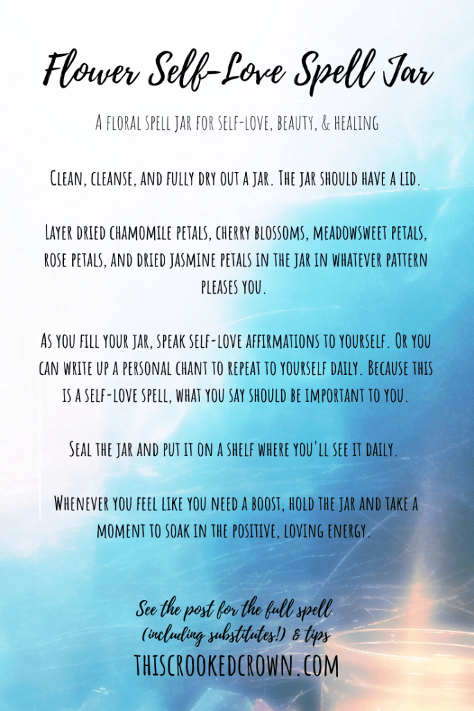 Layer your flower petals in the jar in whatever pattern pleases you. As you fill your jar, speak self-love affirmations to yourself. Or you can write up a personal chant to repeat to yourself daily.